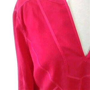 Like new condition. BCBG MaxAzria size Medium. Retail $158. Bold red color. Lux midweight crepe fabric. unique liniear design. Slit v neckline. Long sleeves with tab so they can be cuffed and secured for a half sleeve. Slight high low hem. Relaxed fit. Chest 44 inches. Shoulder to hem approx. 27 inches. Full sleeve length 19 inches. Smoke and pet free home.