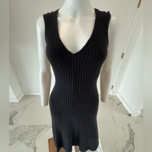 BCBG Knit V neck tank dress in black sleeveless with attached belt. A great and comfy sweater dress perfect for the season. I have only worn it twice and is in an excellent shape. No peeling, no snags .it is an xxs but it is very stretchy and would definitely fit a size xs and small.