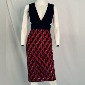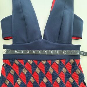 BCBGMaxAzria Rosalina dress size 0x, new with tag. Sleeveless, knee high, cutout on sides, zipper closure mid back, Deep blue and red, deep V back and front. No flaws.