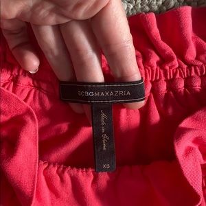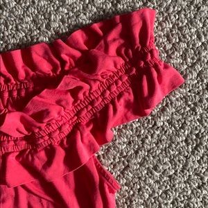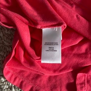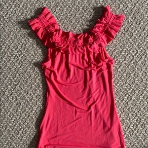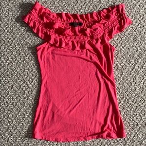 Hot pink Watermelon colored top from BCBG. Adjustable ruffle band at top can be worn off the shoulder or on top of the shoulder, boatneck style. Soft, form fitted material.