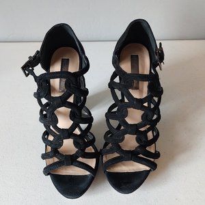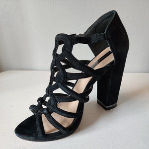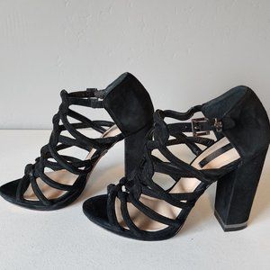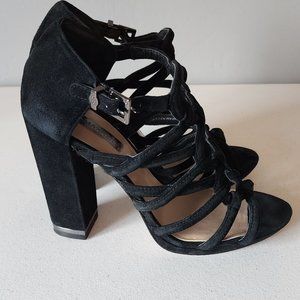 "EUC" Gorgeous Looking Black Suede Cage Style Sandals By BCBG MaxAzria. Adjustable Ankle Strap, Padded Foot Bed, Wrapped 4.5" Heel with Small Metal Bar Accent, Knotted Suede Upper, Great Condition, No Wearing On Uppers, Light Scuffing to Soles, Minor Markings Normal Lite Use Suede:) Rt 210.00 approx.