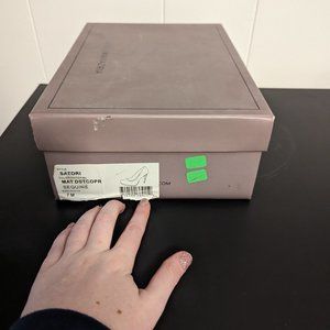 Gleaming BCBG MaxAzria sequined platform pumps in a perfect neutral beige/bronze/brown/almond/copper metallic color with shiny black stilettos, leather soles, and heel helper elastic band.