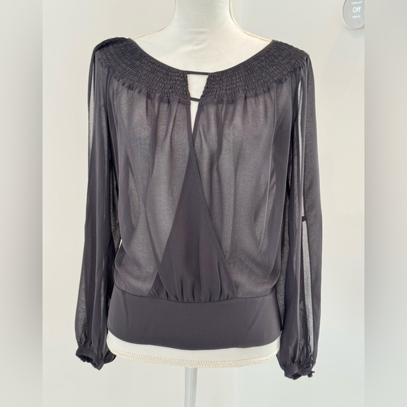 BCBG MaxAzria Sheer top, long sleeves with slits Scooped neck Size XXS Black
