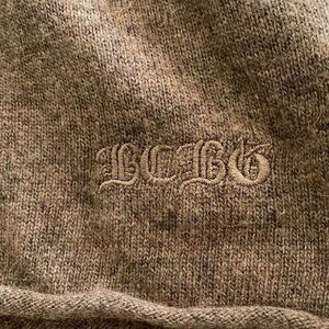 Elegant BCBG Max Azria sleeveless v-neck pullover in taupe/light brown. Features fine knit fabric and sophisticated silhouette perfect for layering or wearing solo.