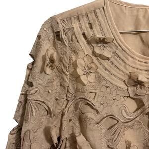 BCBGMaxAzria Tan Floral Appliqué Laser Cut Silk Blend Short Sleeve Top M