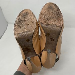BCBG MaxAzria Tan Patent Leather Peep Toe Elastic Strap Heels