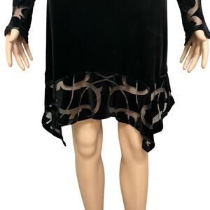 Velvet burnout mini dress. Pointy handkerchief hem. Ornate geometric pattern. Lined in the body but not in the sleeves.