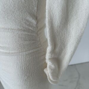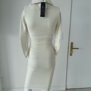 Beautiful deep cowl neck long sleeve sweater dress by BCBG MaxAzria in cream ( gardenia) colour, it’s a size XS brand new with tag no snags no stain. Beautiful minimal cinch at the waist and the on the wrists it fits like a body con dress. It is gorgeous for the fall and winter season under a jacket and long boots.