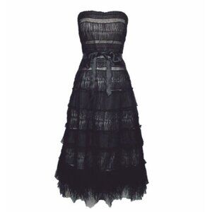 Brand new with tag! Retail: $400. Lined. Lower trim of dress has feather/boa type fringed trim with an inner mesh petticoat type lining to help "fluff" it out. Gorgeous lace/mesh ruched and chiffon poly ruffled detail. Empire waist. Satin poly sash tie belt. Strapless but has straps to help hang or can perhaps wear with the straps but I don't think the straps are meant to be used for wearing, as shown on various manufacturer models wearing it as strapless. Back zip closure. Black lace/mesh overlay with beige/nude satin inner lining that can be shown through for a gorgeous look. Dress has additional inner slip lining that is black. Upper bodice area has light inner boning. Super rare and impossible to find anywhere! Lovely!