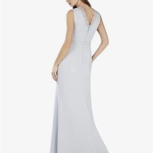 This beautiful dress by BCBG Maxazria features a pale blue color with a lace trimmed v neck. Zippered back. Fully lined.