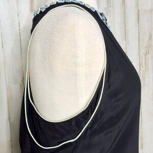 Black flowy double layer chiffon racerback tank with ivory piping trim.