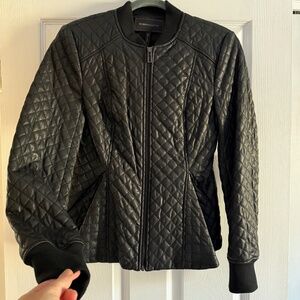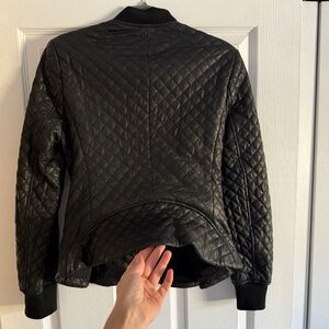 BCBG Maxazria Black Quilted Faux Leather Bomber Jacket Coat with Ruffle Peplum hem Size XS