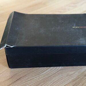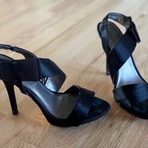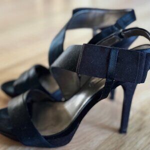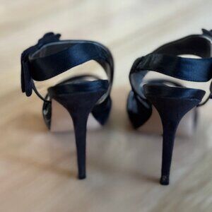 BCBG MaxAzria Black Satin Heels. Bow detail on the ankle. Worn once and kept in box. Slight stitching fix on the ankle elastic. Original box included, damaged box but shoes are fine. 4" heel
