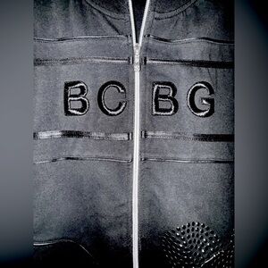 This women's BCBGMAXAZRIA track jacket is a stylish addition to any wardrobe. The black cotton twill material with embroidered logo accents makes it perfect for activewear or casual wear. The full zip and pockets provide functionality while the Y2k theme adds a touch of nostalgia.