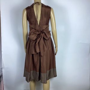 Beautiful 100% silk brown sleeveless fit & flare dress with multiple pleats. Deep V at front & back neckline, & a large belt which ties into a bow at back. Contrasting taupe hem. Size 2. Length from shoulder 40”. Armpit to armpit laying flat 15”. Waist laying flat 13.5”.