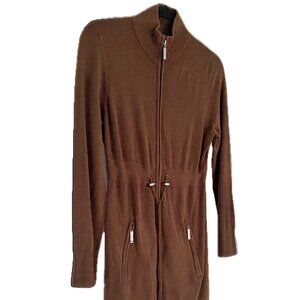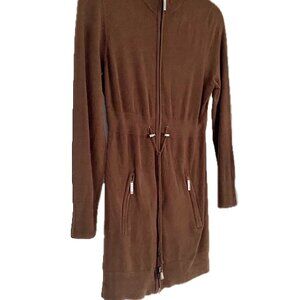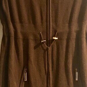 😊BCBG Maxazria Brown Sweater Coat Drawstring Gold Zipper Pockets Mid-thigh Sz L