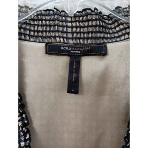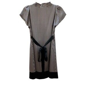 BCBG Maxazria Dress Small Petite Silk Black Beige Checked V-Neck Smocked Waist