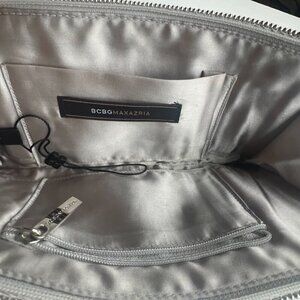 BCBG MAX AZRIA golden, silver, and gunmetal clutch with beads and sequins. Side zipper all around. Satin silver material lining.