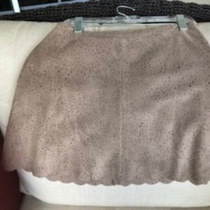 Material is man-made but feels like butter soft suede. Beautifully lined. It zippers up the side, has thin black elastic in the back. A-line skirt. Waist to hem 14 inches. Scalloped bottom. The last picture showing the black elastic is the most representative of the true color. It is a taupe tan. It looks a different shade of tan in every light. Looks great with boots or booties. Fits like an XS or SM.
