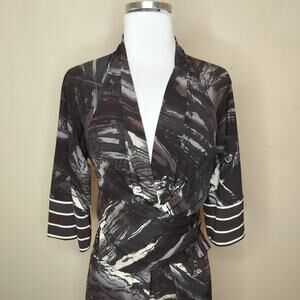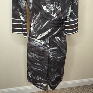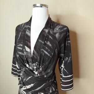 BCBG Maxazria black grey 3/4 sleeve faux wrap dress. Size XS. Poly spandex. (21311)