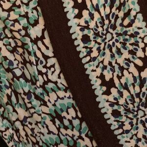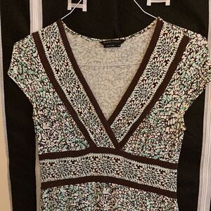 BCBG Maxazria floral print dress with surplus neckline and cap sleeves. Turquoise, aqua, cream, blue & brown.