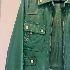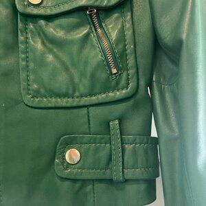 Dress in style with this Kelly Green Leather Jacket by BCBG. Jacket is in excellent condition. Only worn a few times. Gold buttons and zippers adorn the jacket. Jacket has belt that fits around back of jacket.