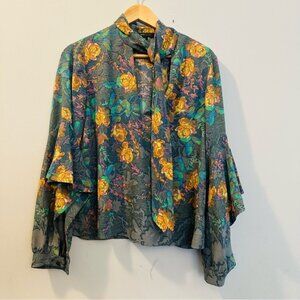 BCBG Maxazria Jade Floral Tie Neck Bell Sleeve Blouse Size Medium Boho