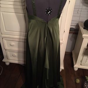 I paid $390 for this dress on sell. I wore it one night. This dress did not fit my manikin all the way, but the zipper zips all the way up and makes the bodice tighter. The tongue to the zipper wasn't on it when I bought it. It has an empire waist that's very flatter with a beaded Halter straps that lead to a plunging back. The back plunges and flows to the floor. This is a floor length gown. I'm 6"0 and the length was plenty long. Size 8. My Grandma added a hook and eye for zipper support.