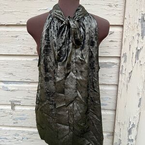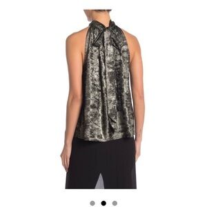A gorgeous BCBG formal halter top…..perfect for a holiday event or other…..beautiful flowing bow at back. This piece is new with tags and in perfect condition. It is 100 % polyester. This is a size medium, but please follow measurements for best fit. It is oversized.