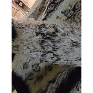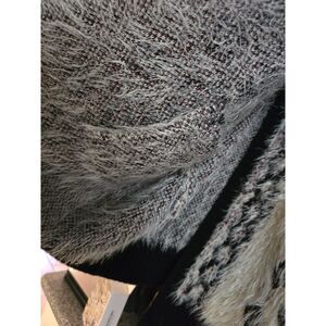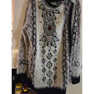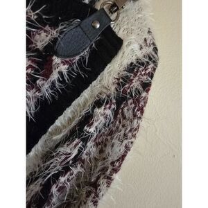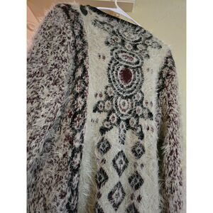 BCBG Maxazria Oversized Fuzzy Cardigan SZ M Aztec Leather Strap Closure Sweater. One side buttons at the shoulder inside the front and the other side clips. Long sleeved and very soft. Unique pattern in maroon and black colors with cream background. Knit ribbed cuffs and waistline. Very nice versatile sweater with leggings or jeans and western boots.