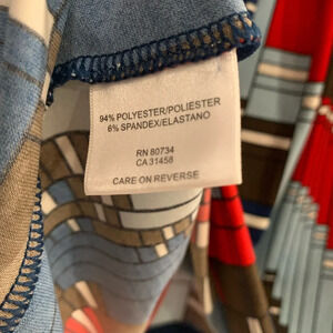Size large dress by BCBG Maxazria. Geometric pattern with red and shades of blue.