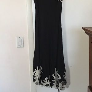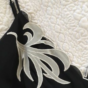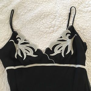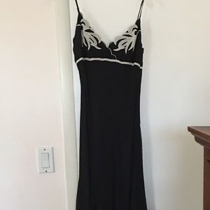 Absolutely beautiful and stunning BCBG cocktail dress, never worn and given as a gift! Packed it for a cruise but never worn! 100% pure silk with embroided cutout grey or silver leaf design bordered with white threading as shown. Dress is lined, has a sewn in black slip. Adjustable straps, zipper on side. Fabric is soft to touch, falls gently into a delicately flared hemline. Wish I could model but its now too small! Your gain, want this beauty to find a home that will appreciate its quality.