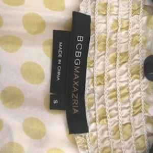 Light greenish/yellow polka dot with paisley pattern on bottom of dress.