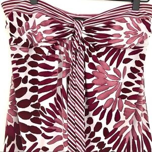 BCBG Maxazria Vintage Strapless Purple and Ivory Tropical Print Tube Halter Dress with tie at neck. Size Small