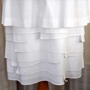 This is a gorgeous BCBG Maxazria white strapless tiered pleated cocktail party prom dress or black tie affair white below the knee spectacular formal dress! As you can see by the photos of the dress on my 4/6 size mannequin I had to pin the dress to hold it up so it is larger then the mannequin. The white layer levels are below the long sweetheart neckline strapless peplum bodice are different widths and scattered sizes on the bottom of the dress with an awesome effect. It's stunning! There is a white lining and the fabric dress fabric is soft as can be. There is a zipper in the back that zips flawlessly and it looks like it's never been worn. Wear this on a cruise, a sunny vacation, prom, cocktail party or just a fun party at your friend's house. It's a truly special work of art!