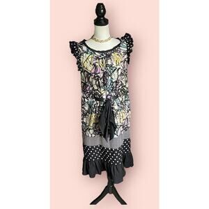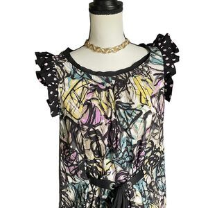 BCBG Maxazria Women's 8 M Ruffle Sleeve Multicolor Black and Pastel Mixed Print Midi Dress Clowncore Unique Artist Quirky Girl Dress. Pulls on- adjust fit with tie belt. Can wear belt tied in back or front. Side Seam Pockets!