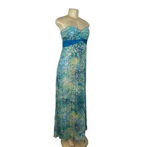 "Bcbg Maxazria Women's green and blue empire dress, size 6. Maxi, strapless style with abstract pattern, hints of gold, sinched bust. Ideal for formal events, summer, spring or black tie occasions. Made of comfortable, quality polyester. Features back zipper for easy wear."