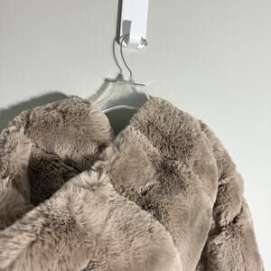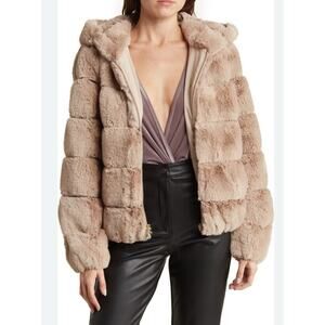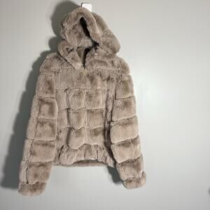BCBG Maxazria Womens L Tan Faux Fur Quilted Jacket Hooded Luxury Soft Zip New