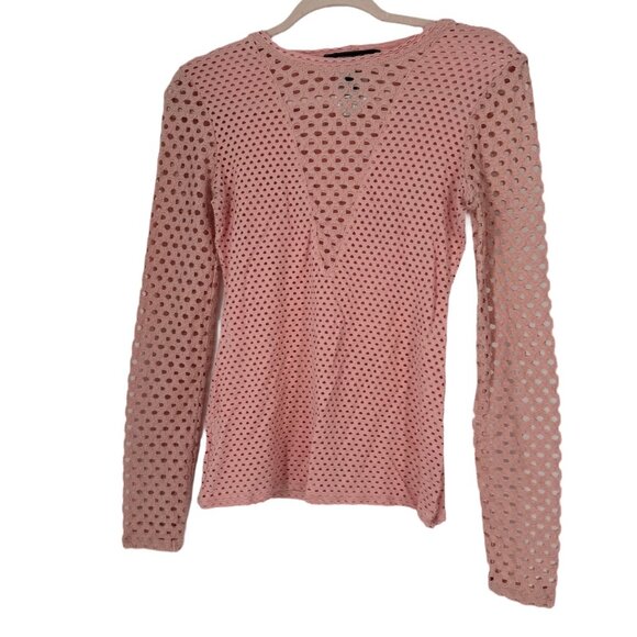 BCBG Max Azria top, sheer mesh blouse, eyelet perforated top, pink mesh shirt, V neck sheer top, long sleeve mesh top, women’s designer blouse, layered fashion top, minimalist chic blouse, modern women’s wear