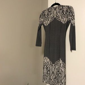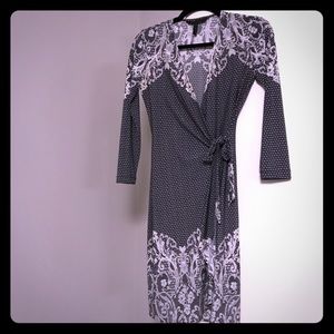 Lace print wrap dress with tie waist and 3/4 sleeves.