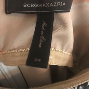 BCBG Maxazria strapless short ruffle dress, boning built in, form fitting while very flattering since the ruffles hide imperfections. Worn only once to a wedding
