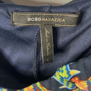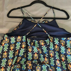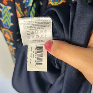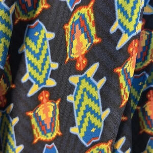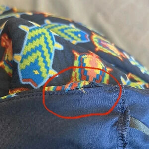 Background color is navy with black detail see close up picture of fabric. Fish and turtle print. The only blemish that I see is under the right arm pit- it has came in stitched a little. Had I not been looking so close I would have never saw it. See picture.