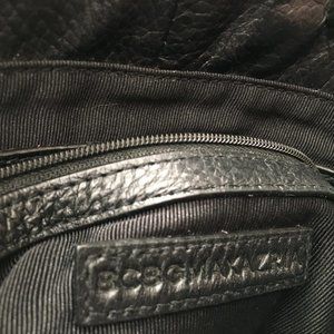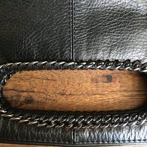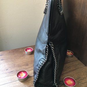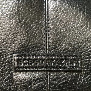 BCBG Mazxazria . Eye-catching Pebbled Leather Chain Link Bag. Immaculate condition, lightly used, magnetic clasps, reasonably deep handbag. Light marks on one magnetic clasp and trim of bag (less than1/4 inch, barely visible had to really zoom to capture them). Dimenions: Widest part 13 " (L) 12 1/2" (H), Smallest part 12" (L) 12 1/2 " (H), from below the chainlink handle 13" (L), 10" (H) . Dustbag is a little dusty....