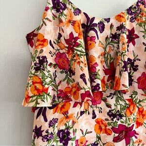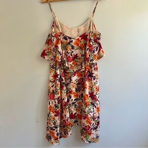 BCBG NWT Floral Ruffle Dress Feminine Spaghetti Strap Popover Size Medium. Adjustable straps, fully lined, silky feeling, side zip. Beautiful coloring, pink purple orange green. Lightweight and flowy!