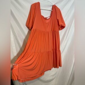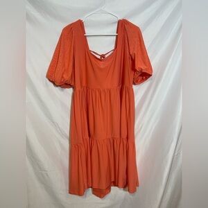 Elegant orange midi dress by BCBG. Features eyelet puff sleeves and a tiered skirt.