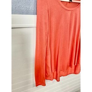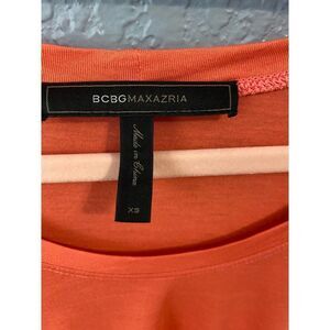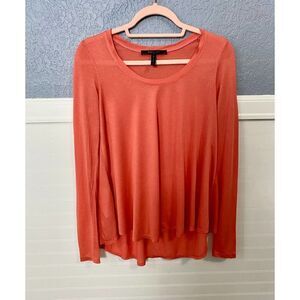 This BCBG top features a solid orange color, a scooped neck and long sleeves.