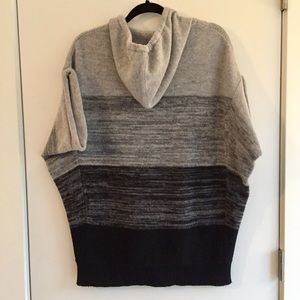 BCBG Oversized Ombre Wool Blend Hoodie Sweater. 80% Wool/20% Cashmere. Round neck, relaxed elbow-length sleeves, ombre grey and black stripes. Drawstring at neck with pouch pocket at lower front ribbed hem. Draped hood in the back. Used but in good condition. Please refer to the photos.