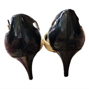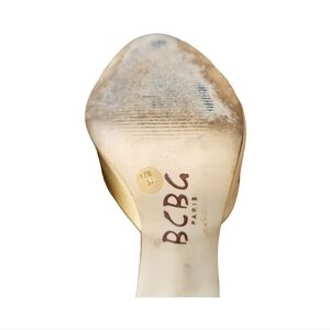 These BCBG heels feature a sophisticated d'Orsay design with a striking black and butter yellow color combination. The elegant ankle straps add a touch of refinement, making them perfect for any stylish occasion. With a medium heel height and peep toe, they offer both comfort and timeless appeal. In good condition. Some scuffing on the heel.