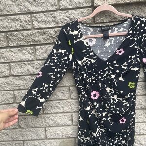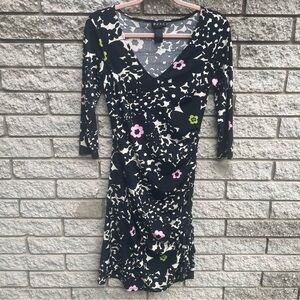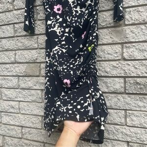 BCBG Paris Black Floral Print V Neck Ruched Midi Dress Women's Size Small