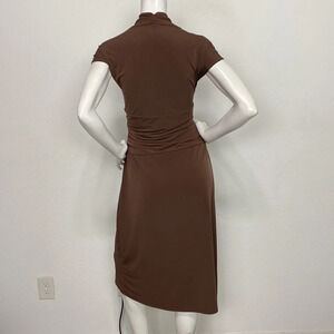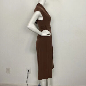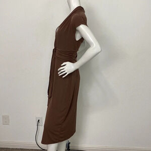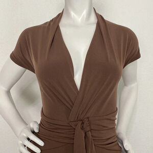 BCBG Paris Brown Romantic Deep V-Neck Front Tie Cap Sleeve Ruched Midi Dress L